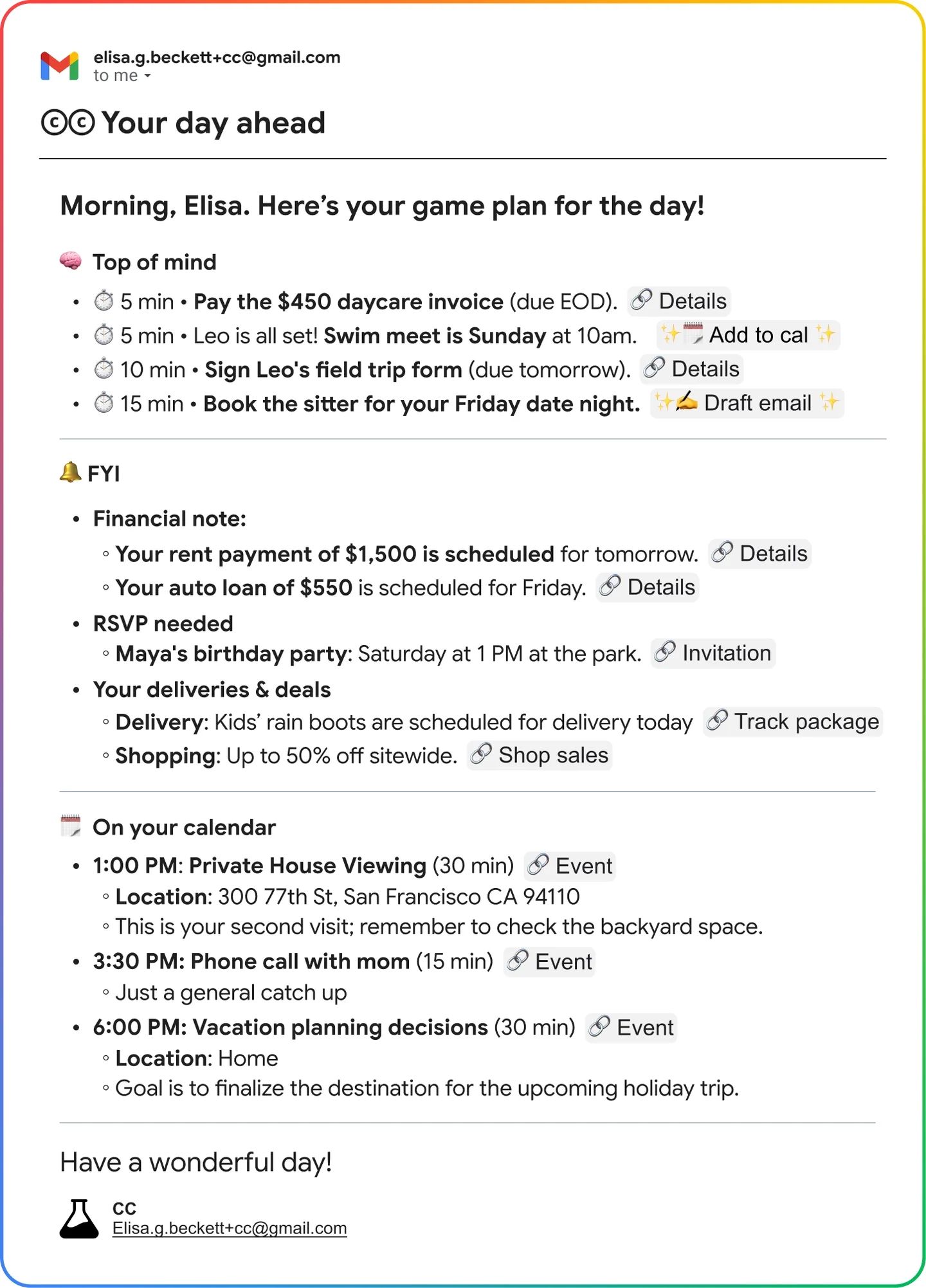 CC 需主動申請並可隨時中止,用戶可透過電郵訓練及調整每日「Your Day Ahead」摘要,但 CC 只會私下回覆你本人。所有資料均依 Google 私隱政策處理,若要完整刪除資料,必須正式斷開 CC 服務。